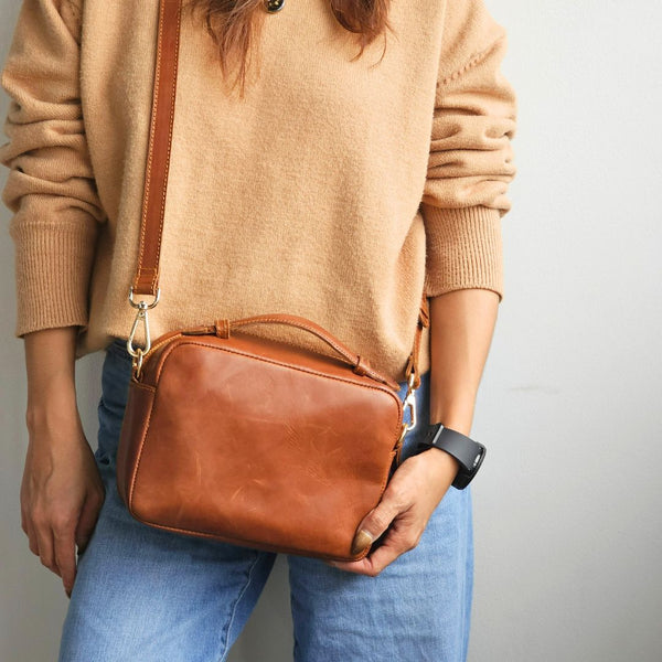 Inspired by the camera bag, Betsy is both fun and functional. The strap is made detachable if you prefer to use a printed strap over your regular leather strap.
